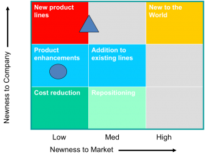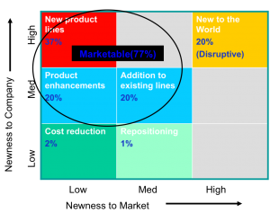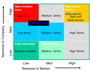 In the context of technology transfer, the first step is to identify the market standards—in this case, the particular product mix that is indicative of the industry the technology is directed towards. For this, we have modified a “Newness Map”, suggested by Robert Cooper (the Godfather of StageGate and NPD), which illustrates the average mix of a high-tech company.